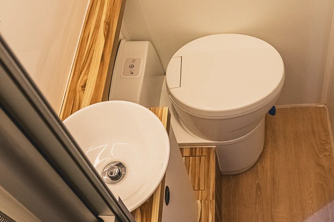 O banheiro é completo e funcional, trazendo vaso portátil, box de banho separado e toalheiro elétrico em 24V, garantindo conforto e praticidade mesmo em regiões de clima frio.