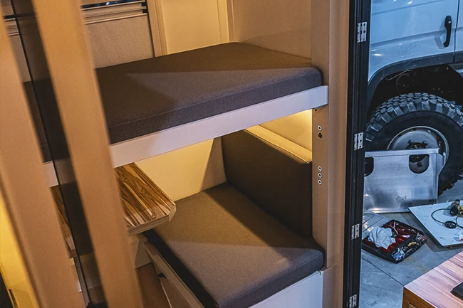Com acomodação para até 4 pessoas, o espaço interno foi cuidadosamente desenhado para oferecer praticidade e conforto. Duas camas de casal, sendo ambas montadas a partir da dinete, proporcionam versatilidade no uso do ambiente. A cozinha interna conta com pia com água quente e fria, fogão a GLP e forno, enquanto a cozinha externa amplia as possibilidades com fogão a gás e pia adicional, permitindo momentos únicos ao ar livre.