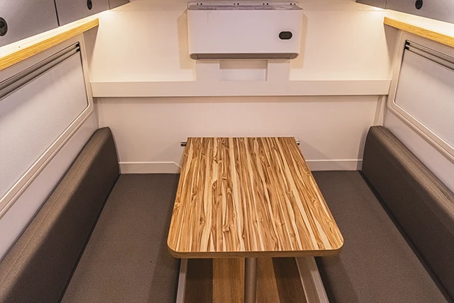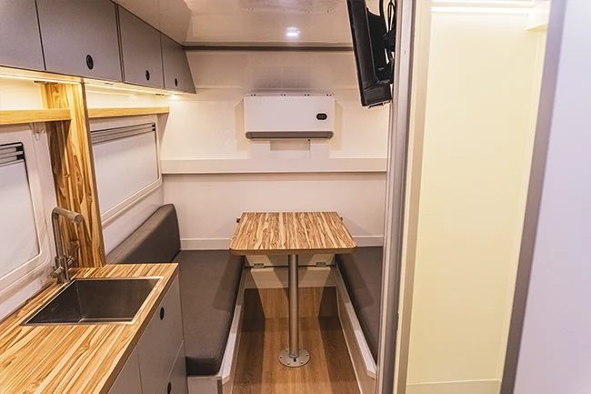O sistema hidráulico oferece autonomia com 250L de água potável, 100L para águas cinzas e bomba Shurflo de alta eficiência.