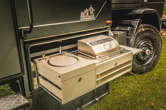 No interior, a casa sobre rodas foi projetada para oferecer acomodação confortável para até 5 pessoas, com duas camas de casal (sendo uma montada na dinete) e uma cama suplementar superior. A cozinha interna é um show à parte, equipada com pia com água quente e fria, fogão de indução, forno elétrico e opção de backup a GLP — garantindo versatilidade e independência total. Para quem prefere cozinhar ao ar livre, a cozinha externa com churrasqueira a gás e pia completa amplia a experiência de convivência e liberdade.