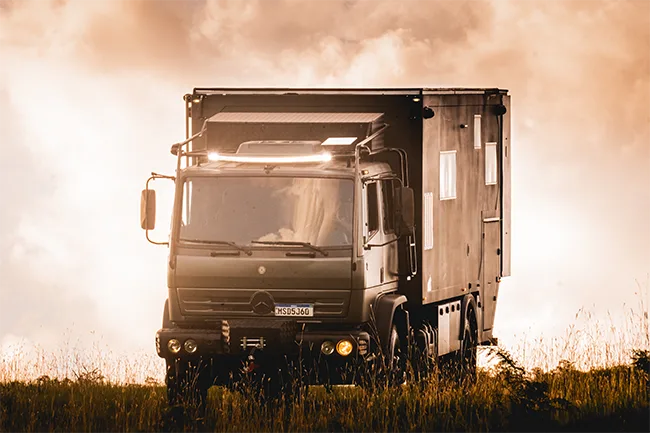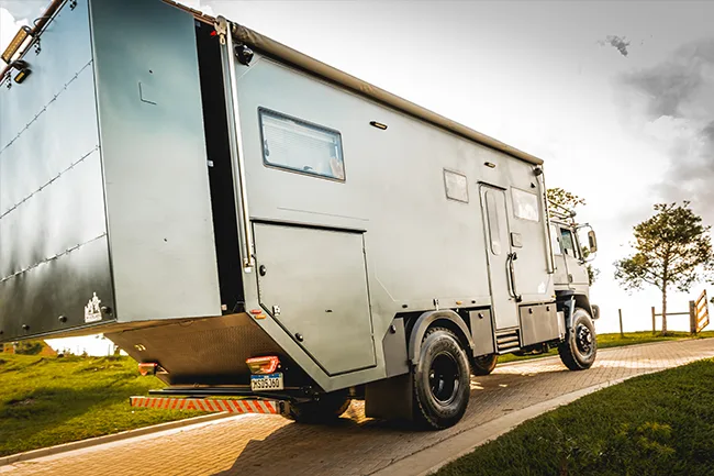 Construído sobre a robusta plataforma Mercedes-Benz 1720, com cabine dupla para até 5 passageiros, o Brutus impressiona já no primeiro olhar com sua pintura em preto fosco exclusivo e presença imponente. Cada detalhe do exterior foi planejado para unir praticidade e resistência: rack de teto com box de armazenamento, tulha traseira para step, barco inflável e equipamentos, além de paredes de 50mm em painéis insulados de fibra de vidro com núcleo em PIR, garantindo máximo isolamento térmico e acústico.